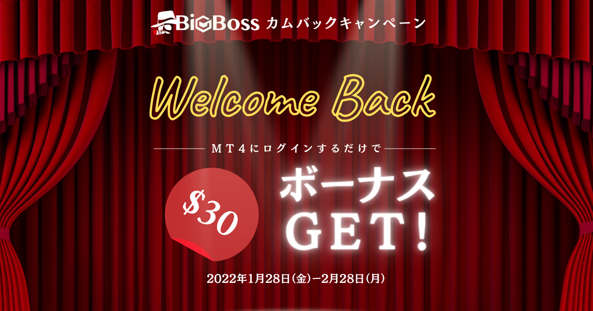 BigBossからご案内メールが届いたお客様限定! キャンペーン対象のMT4口座にログインして頂くだけで、$30のクレジットボーナスプレゼント! キャンペーン詳細 ※本キャンペーンの適用に当たっては、...