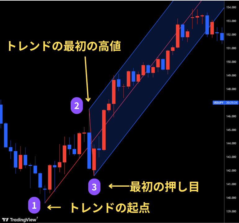 この3つのポイントを順番に押さえることで、アンドリューズ・ピッチフォークを適切に引くことができます。