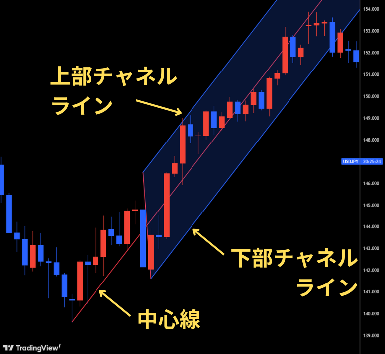 一方、下降トレンド時には、上部チャネルラインがサポートライン、下部チャネルラインがレジスタンスラインとして機能します。