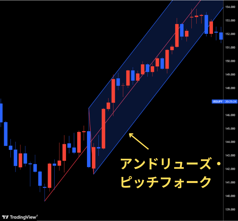 アンドリューズ・ピッチフォークは、トレンド相場における順張りトレードに効果的です。