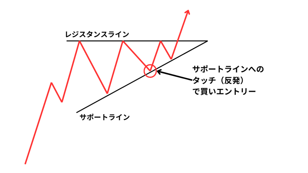 アセンディングトライアングルの代表的なエントリーの目安は「レジスタンスラインを上に抜けたとき」または「サポートラインを反発したとき」です。