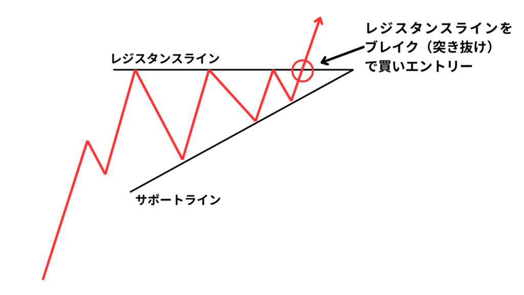 レジスタンスラインが上に突き抜けたことを確認できたら、大きな上昇が発生する可能性があるため、買いエントリーをするのが効果的です。