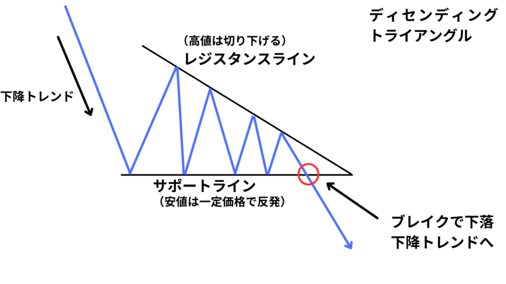 ディセンディングトライアングルは、下落型の三角形のチャートパターンで、下降トレンドの発生や継続を示唆します。