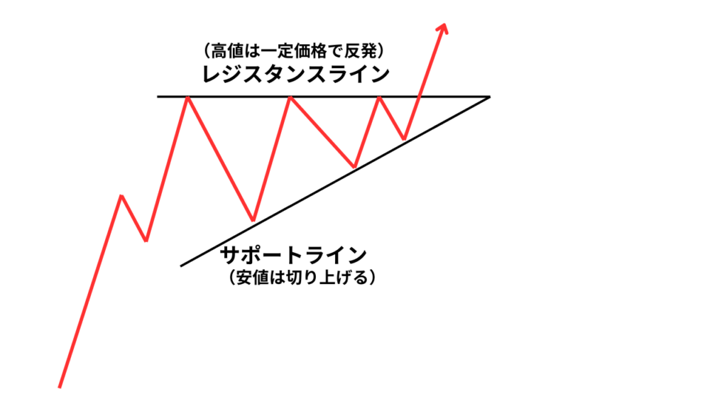 アセンディングトライアングルとは、高値同士をつなぐレジスタンスラインと、安値同士をつなぐサポートラインが形成する上昇型の三角形のチャートパターンです。