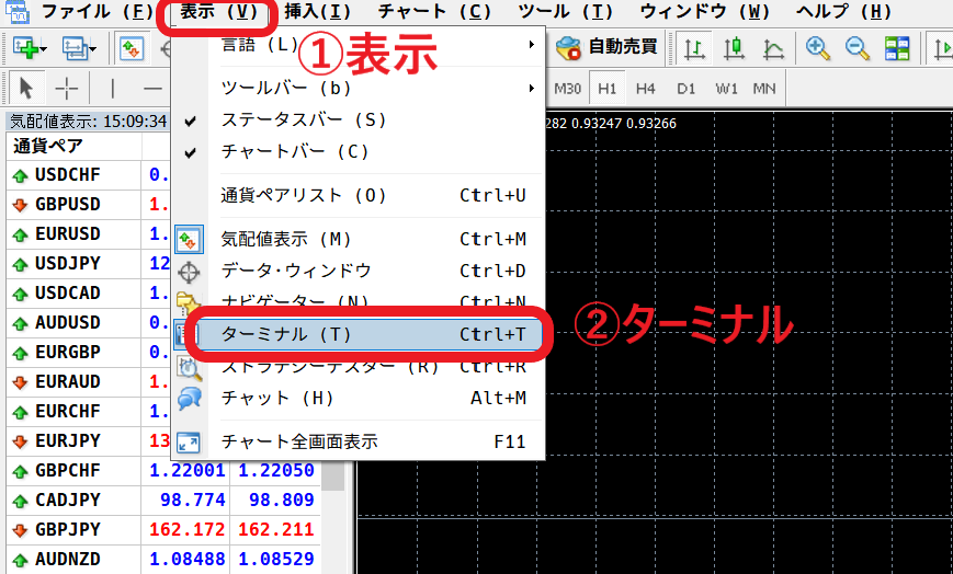 MT4/MT5の画面下に「ターミナル」が表示されていない場合は、画面左上の「表示」から「ターミナル」をクリックして表示させます。