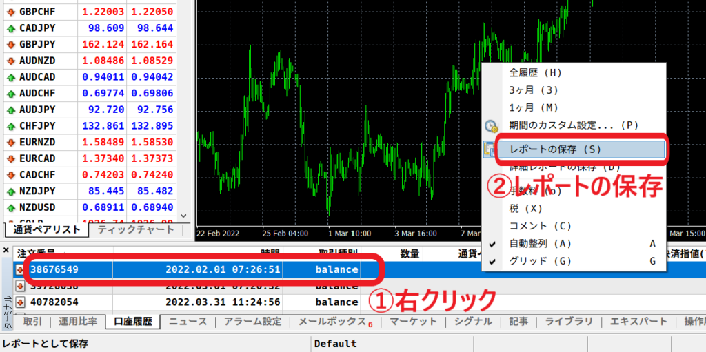 期間指定が完了すると1年分の取引履歴が表示されるので、「口座履歴」画面で右クリックし、「レポートの保存」をクリックします。