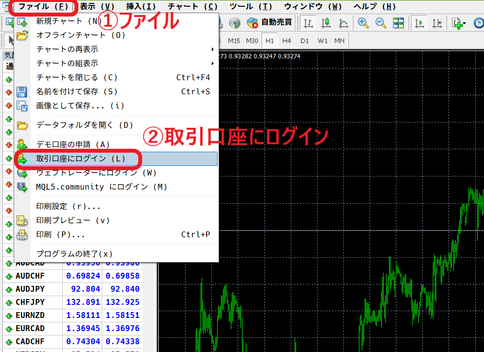 もしログインのポップアップ画面が表示されない場合は、画面左上の「ファイル」から「取引口座にログイン」をクリックしましょう。そうするとポップアップ画面が表示されます。