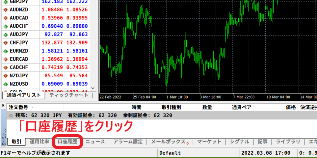 画面下の「ターミナル」にある「口座履歴」タブをクリックして、画面を切り替えます。