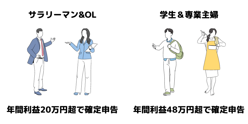 | 給与収入がない人(学生や専業主婦など) | 海外FXの年間利益が48万円を超えた場合 |