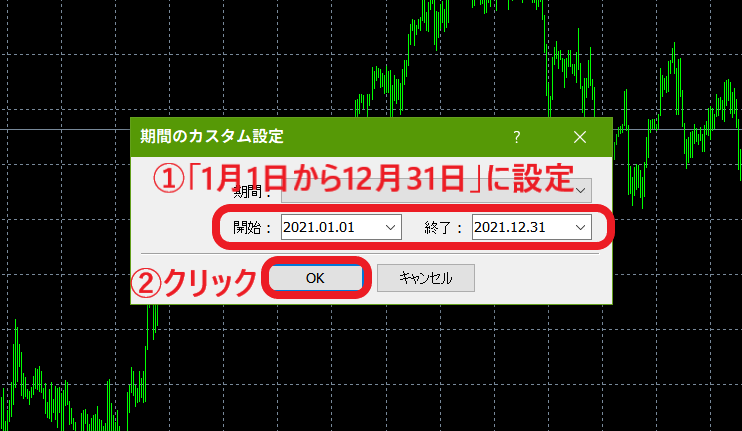 「期間のカスタム設定」画面で確定申告をする年の1月1日から12月31日を指定して、「OK」をクリックします。