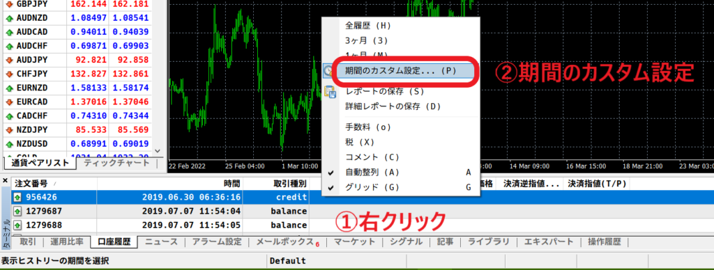 「口座履歴」の画面上で右クリックし、「期間のカスタム設定」をクリックします。
