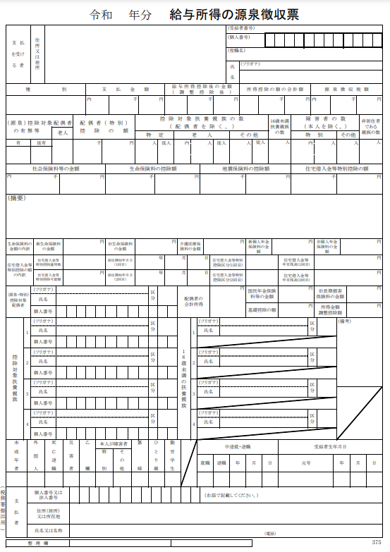 1年間に会社から支払われた給与や手当、賞与、会社が代わりに納めた所得税(源泉徴収)の金額などが記載されている書類。