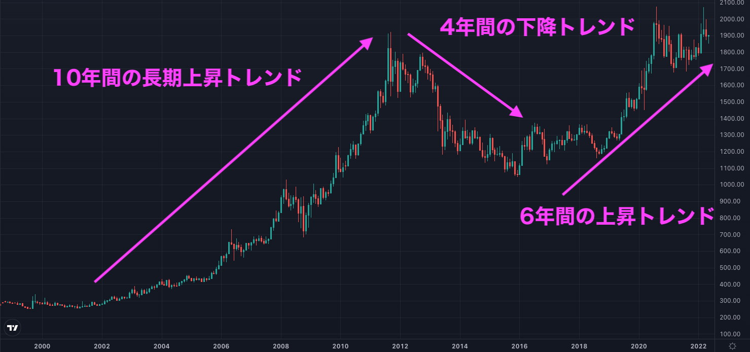 実際に、ゴールドの相場は2000年以降、3度長期的なトレンドが発生しています。