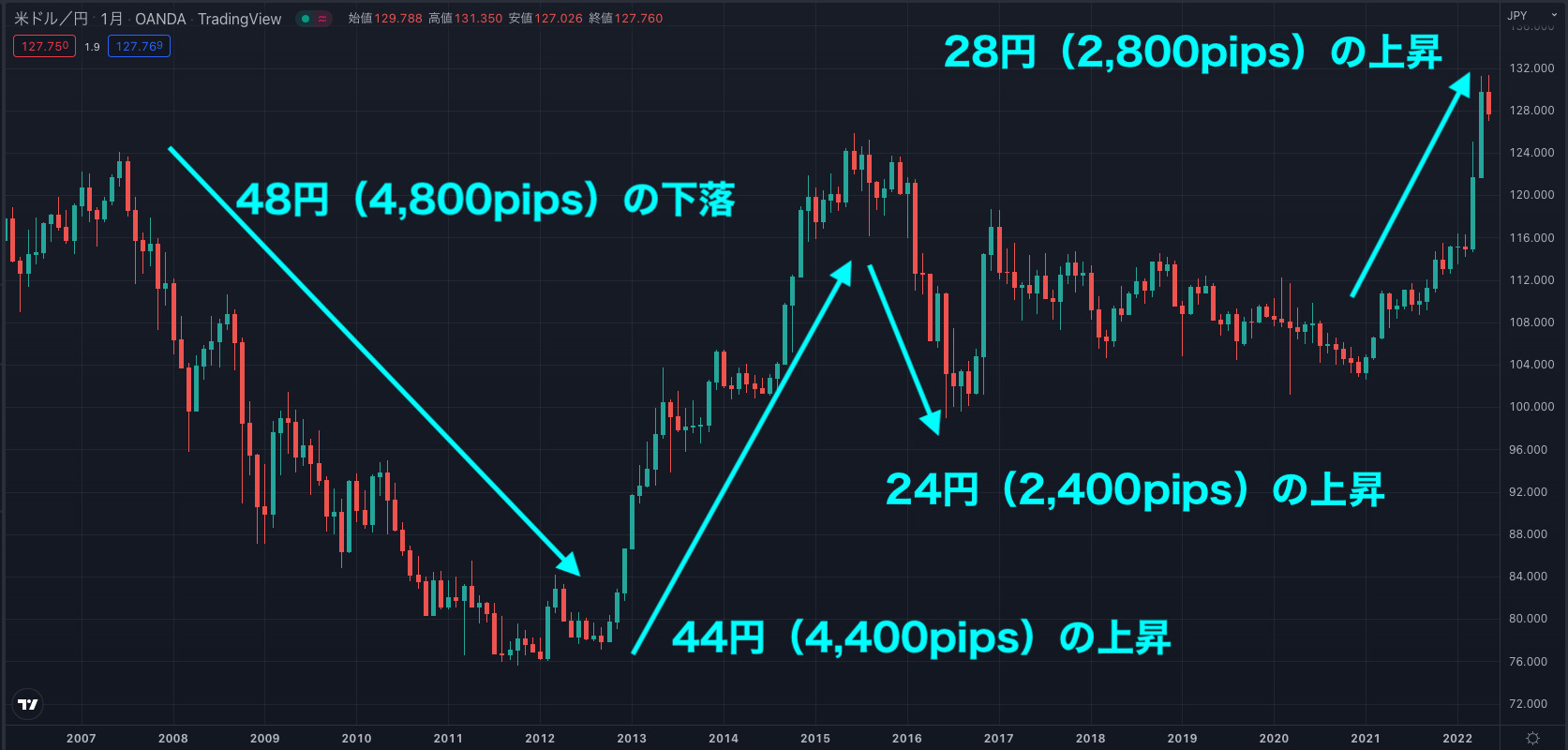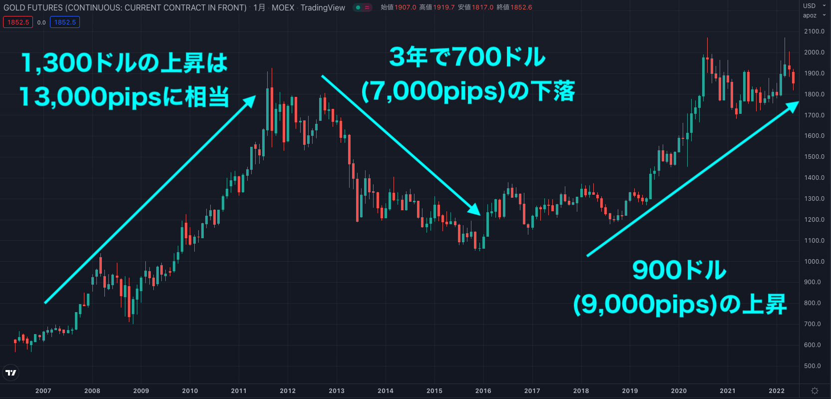 ゴールドの値幅は数千pips、まれに1万pipsを超えるようなトレンドが発生しています。