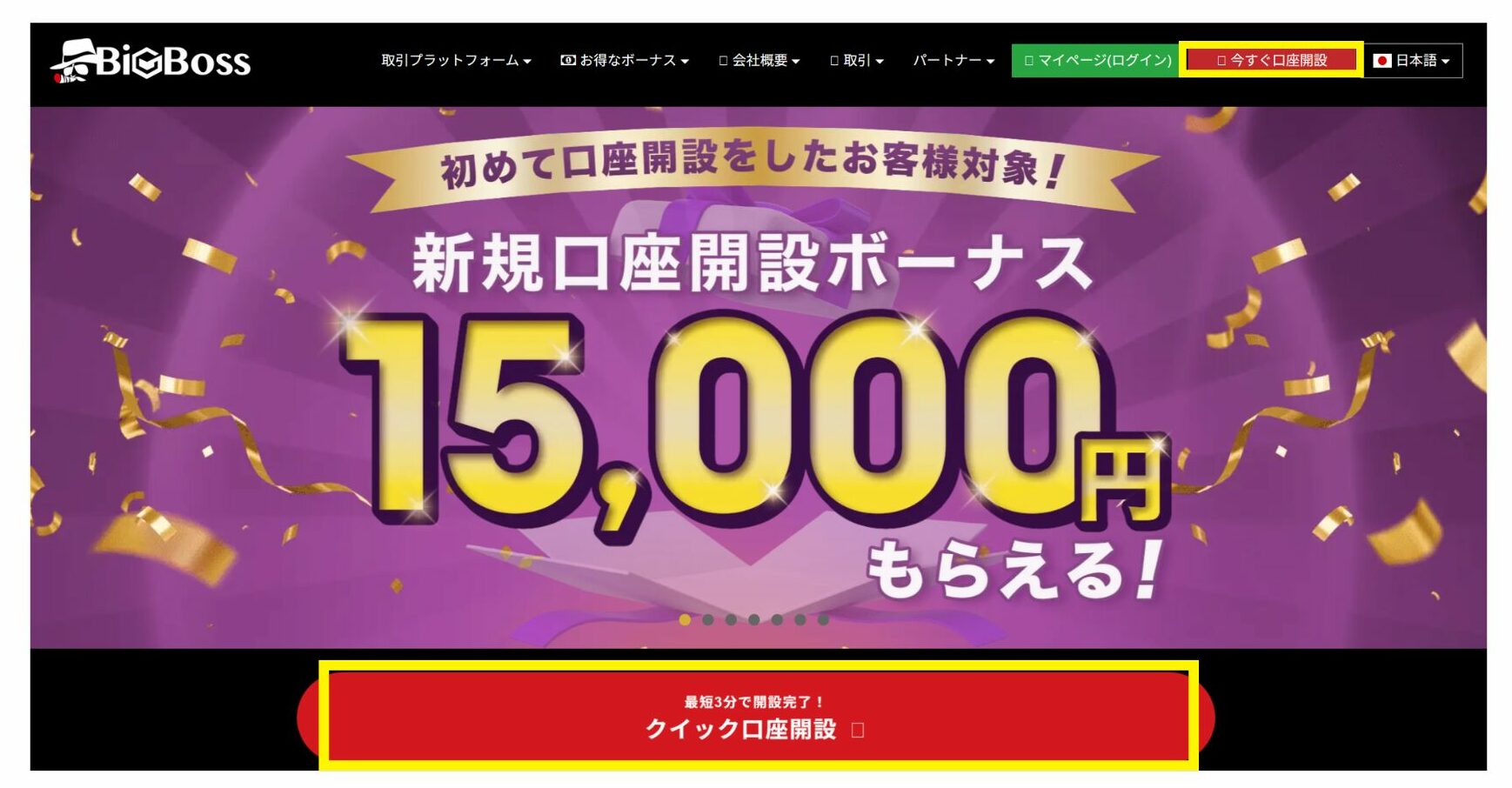 BigBossで口座を開設する際は、サイトトップの右上「今すぐ口座を開設する」か、中央の「クイック口座開設」から簡単に開設ができます。