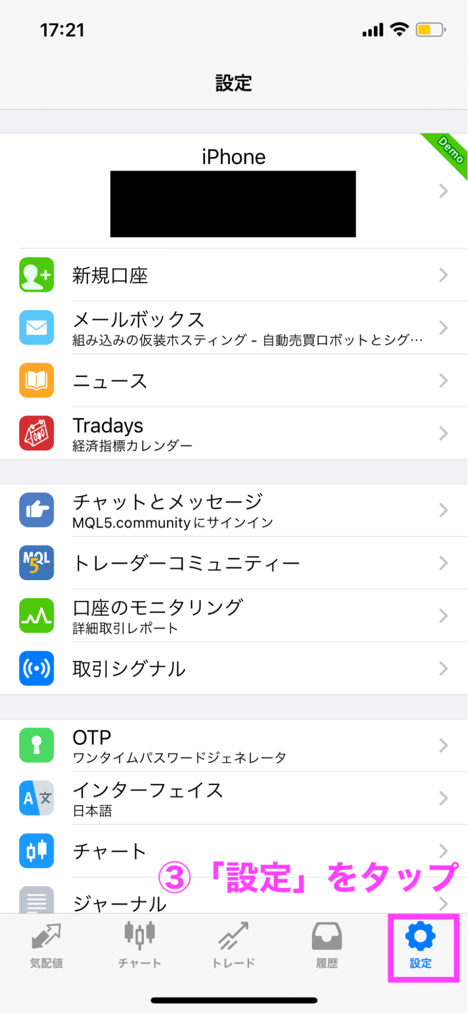 メタトレーダーを開いたら、右下の「設定」をタップします。