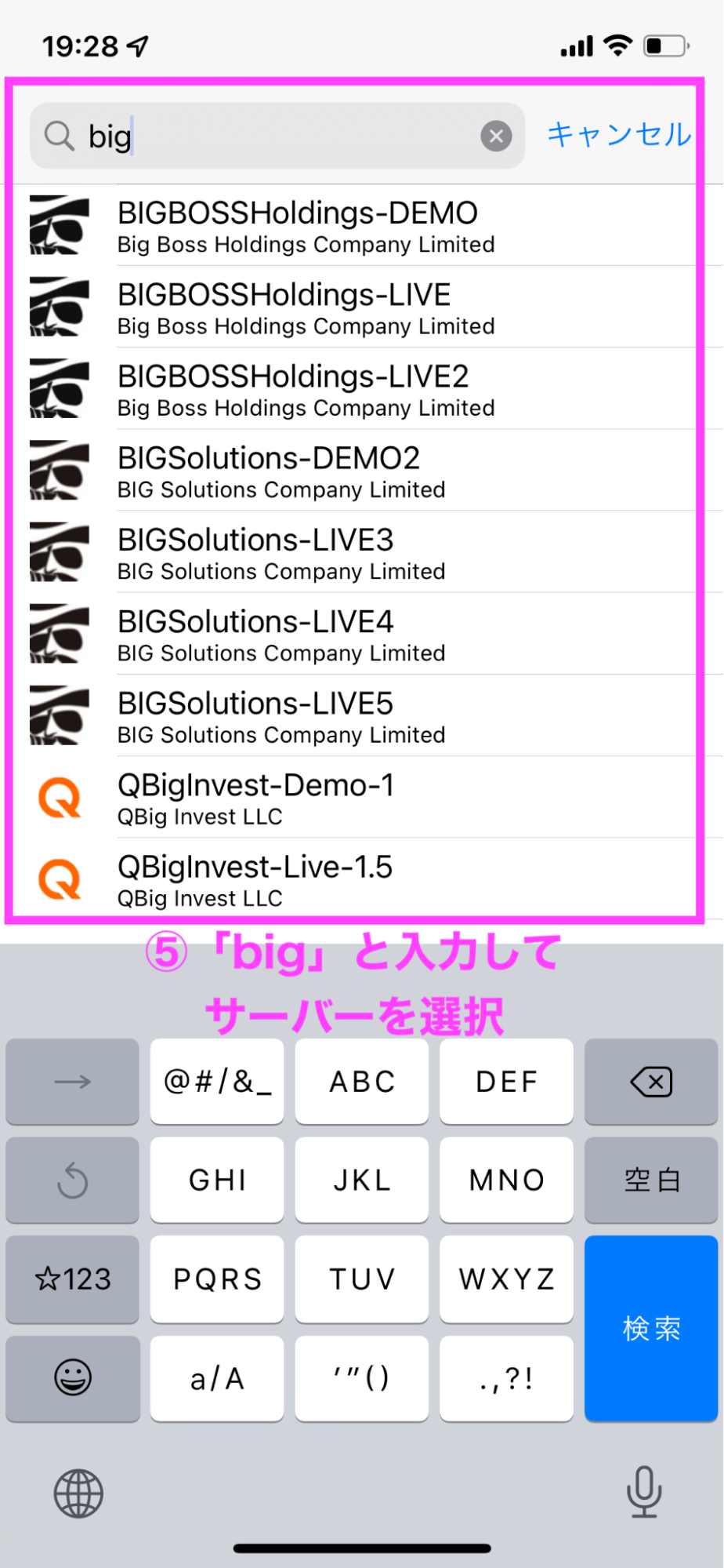 検索欄に「big」と入力してください。するとサーバーが出てくるので、メールアドレスに届いている口座情報を元に、該当するサーバーを選びましょう。