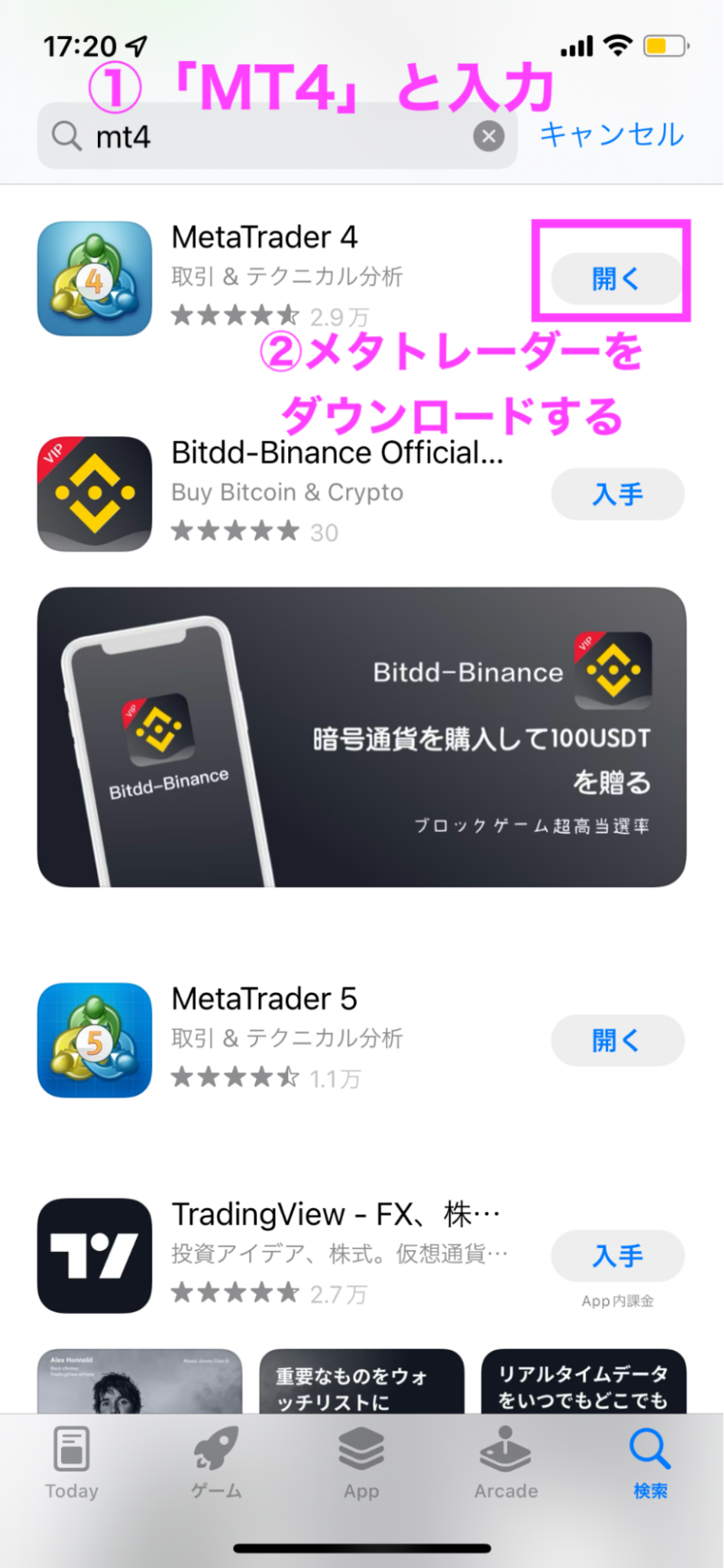 検索欄に「MT4」と入力すれば、MT4のアプリが表示されるので選びます。