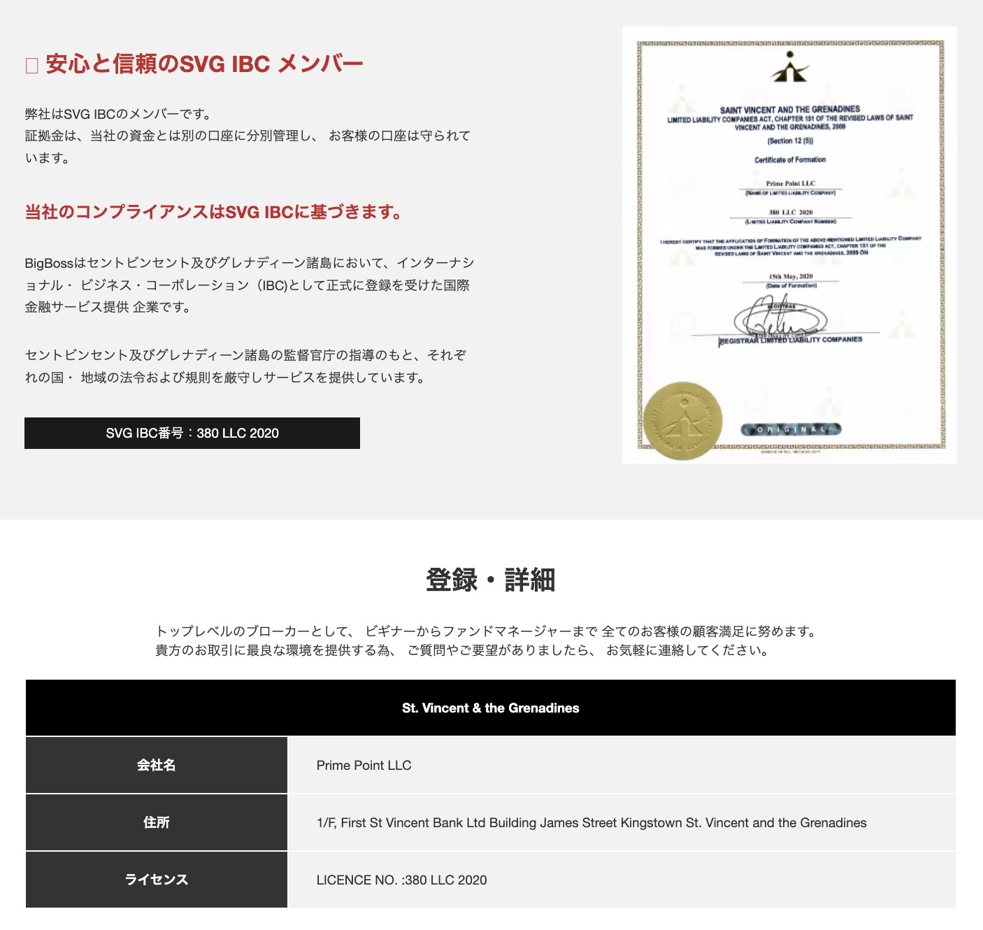 BigBossは、セントビンセント・グレナディーン金融庁の金融ライセンス(番号:380 LLC 2020)を取得しています。