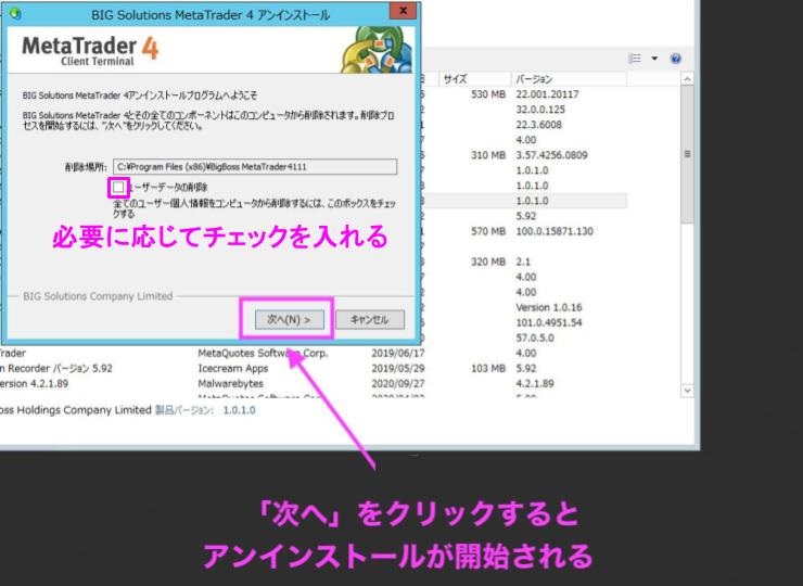 「ユーザーデータの削除」にチェックを入れずにアンインストールすると、MT4内に保存したアカウント情報やインジケーター、EAといったデータが残ります。