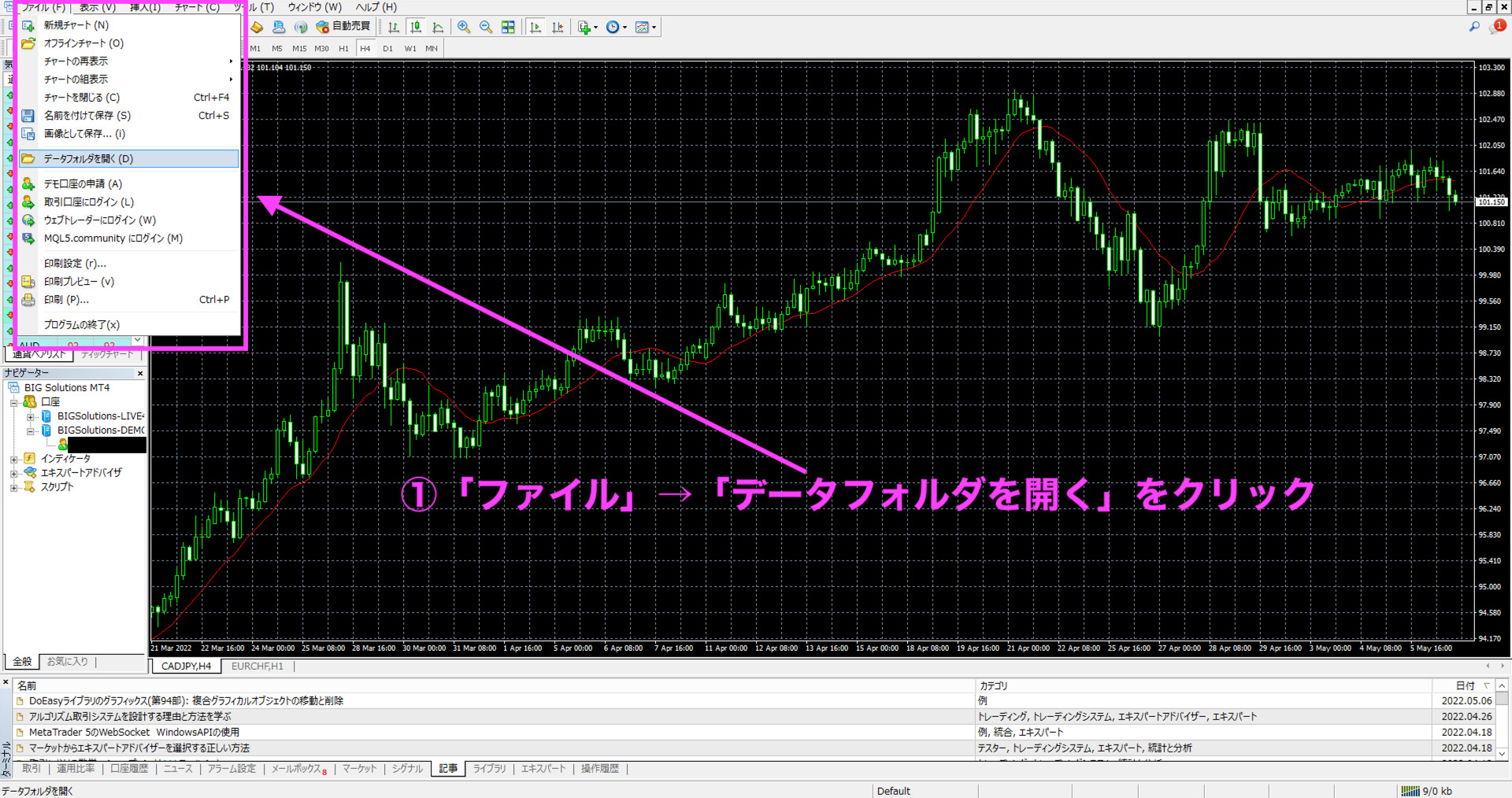 保存したいデータがあるときは、MT4の左上にある「ファイル」から「データフォルダを開く」を選択します。