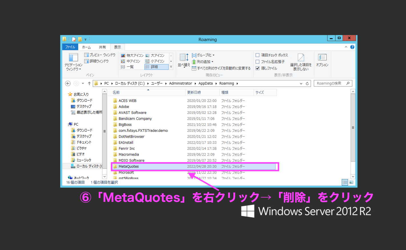 「MetaQuotes」を右クリックしたら「削除」を選択しましょう。