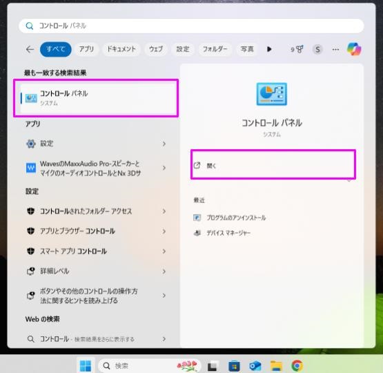 「スタート」メニューをクリックし、検索窓に「コントロール」と入力します。