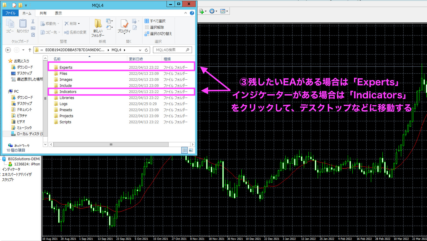 残したいEAがある場合は「Experts」、インジケーターがあるときは「Indicators」をクリックしてデスクトップなどに移動させておきましょう。