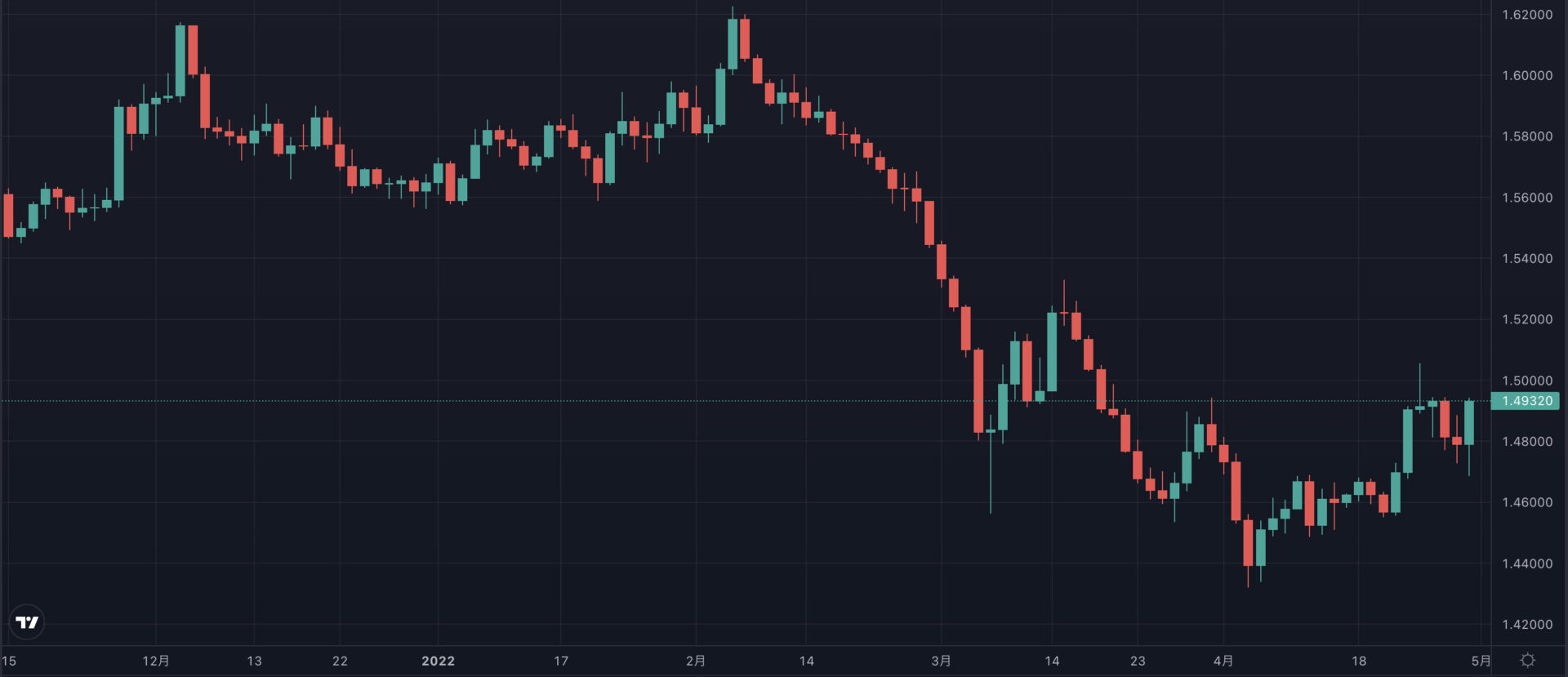 2022年1月以降、ユーロ/豪ドルの価格は下落傾向にあり、4ヵ月で1,700pipsも下落しています。