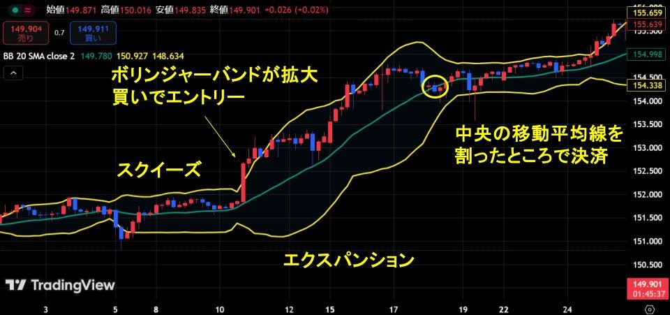 一方、ボリンジャーバンドが拡大している状態をエクスパンションといい、スクイーズの発生後に見られることが多いです。