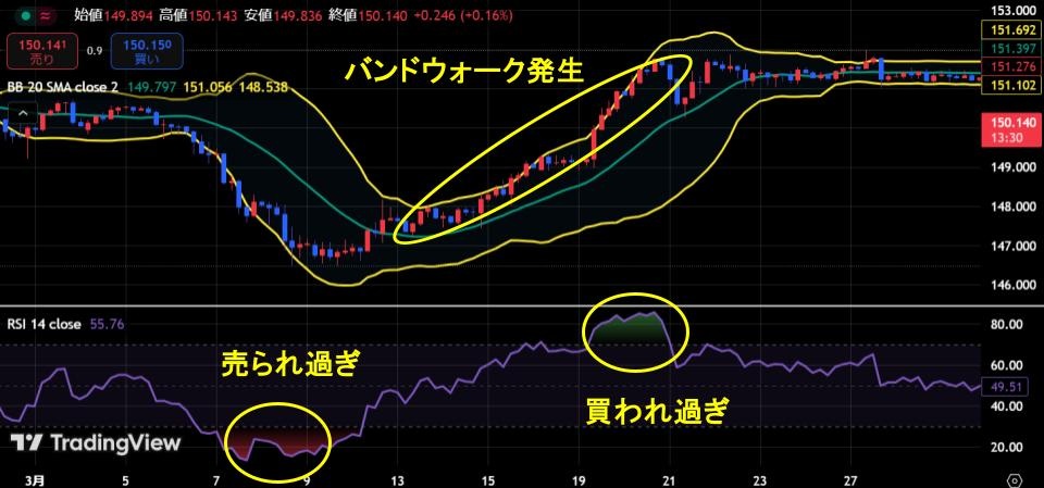 下図のチャートのように、RSIが30%以下を示したあとに、バンドウォークが見られたら、買いで順張りするのが効果的です。