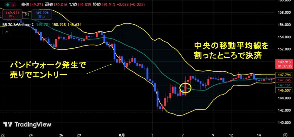 下図のように、-2σに沿ったバンドウォークが確認できたときに売りでエントリーし、中央の移動平均線を割ったところで決済するのが効果的です。