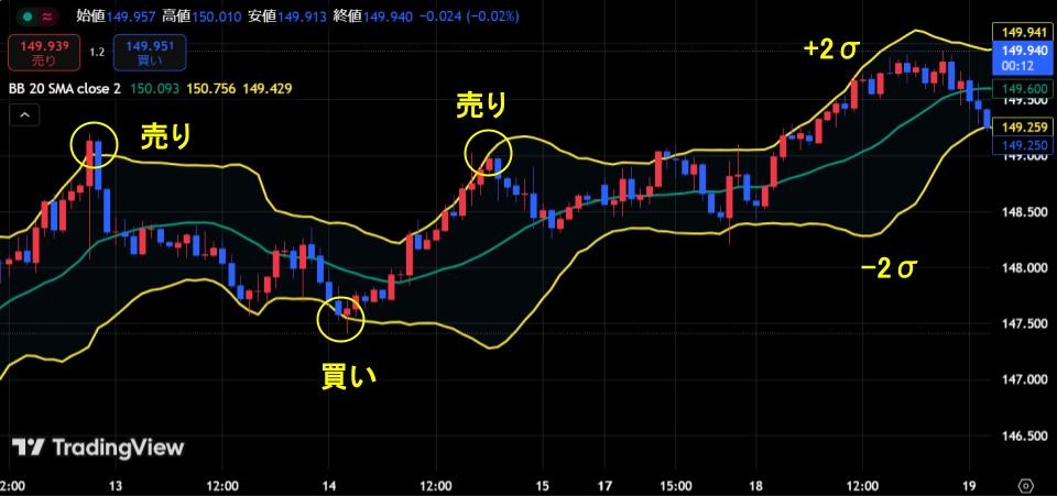 下図のチャートでは、+2σに価格が触れたら売り注文、-2σに価格が触れたら買い注文を入れるのが効果的です。