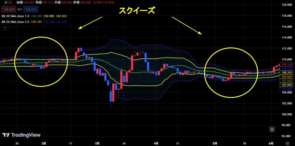 スクイーズとは、ボリンジャーバンドが下図のように収縮している状態をいい、価格のもみ合いを表します。