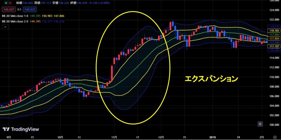 スクイーズからエクスパンションへの移行が確認できたときは、大きなトレンドが発生する可能性があります。