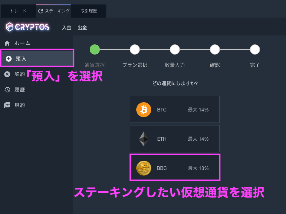 BigBossではBigBossCoin(以下、BBC)に加え、BTCやETHといった人気の仮想通貨のステーキングも扱っています。