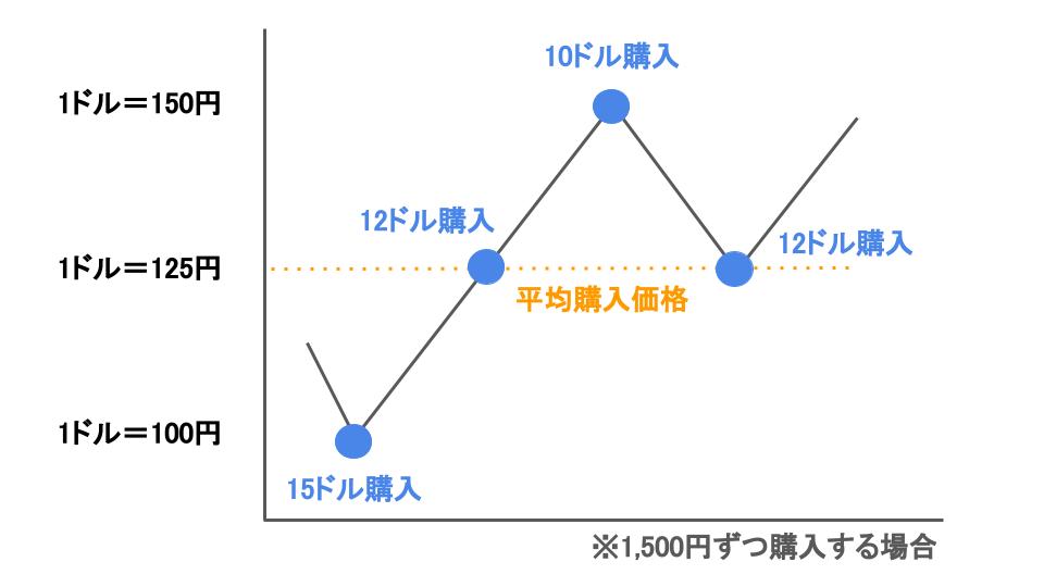 毎回1,500円ずつ米ドル/円を購入するように設定した場合、1ドル150円のときは10ドル、1ドル100円のときは15ドルと購入金額に応じて通貨量が調整される