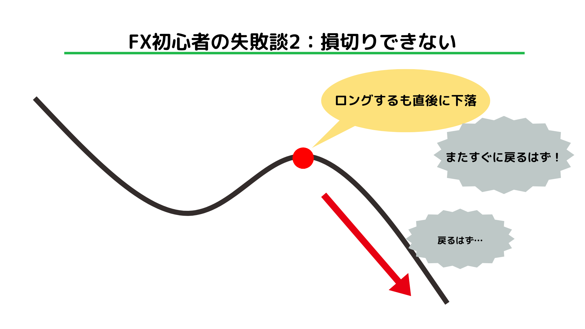 またすぐに上がると思っていたが、なかなか上がらず、そのまま損切りするタイミングを見失い、含み損が大きく膨らんでしまった」