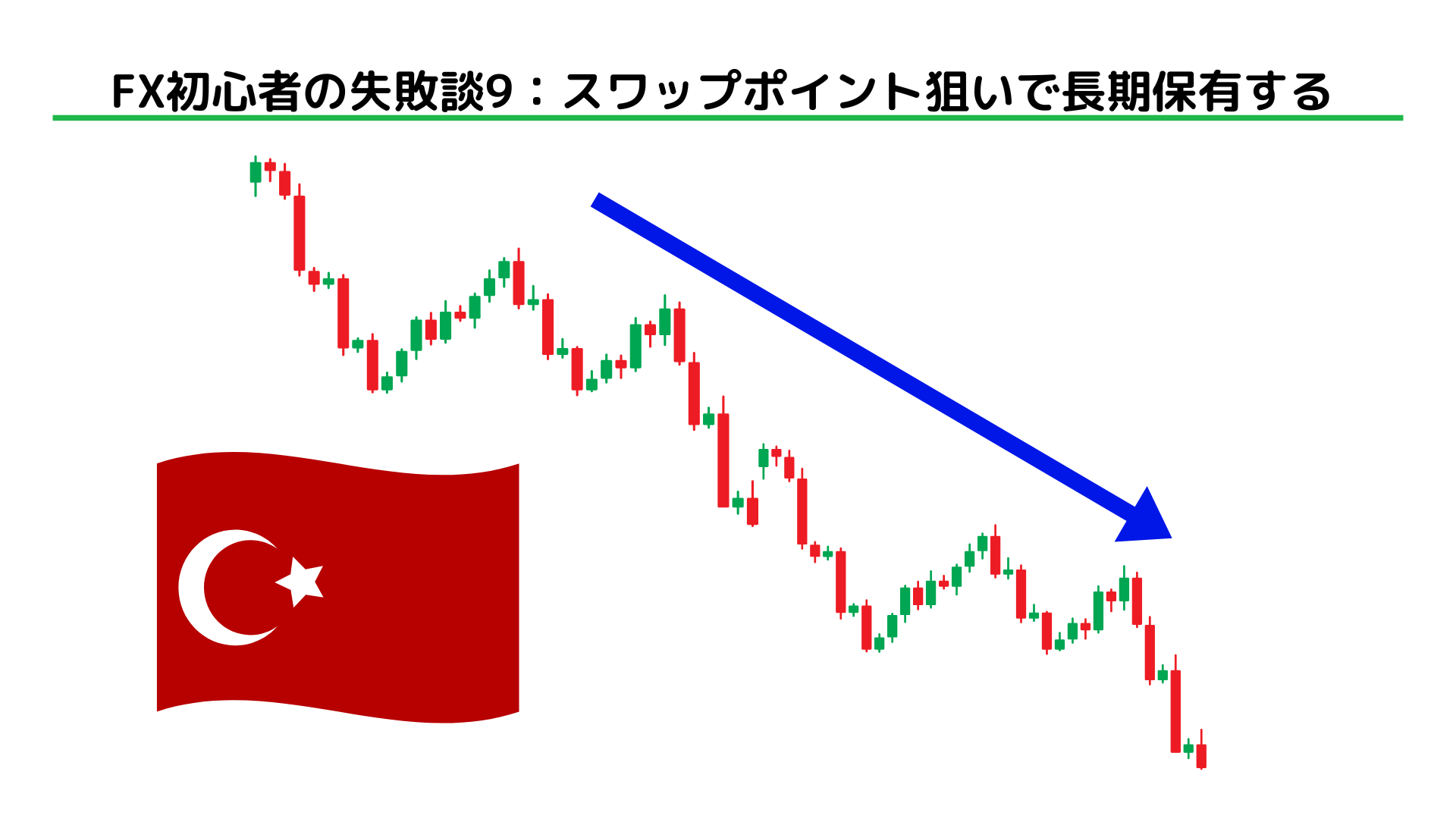 「スワップポイントを狙いトルコリラをロングするも、価格が下がり続け、スワップポイントよりも大きな損失が出てしまった」