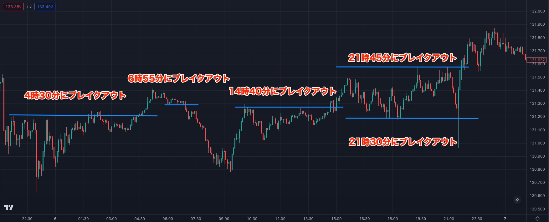 下図の2023年4月6日における米ドル/円の5分足チャートでは、レンジ相場のブレイクアウトが5回発生していますが、仮に18時以降にしかトレードができない場合、1日のエントリーチャンスが2回しかありません。