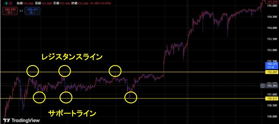 ブレイクアウト手法は、サポートラインやレジスタンスラインを引くだけで、エントリーチャンスを見極めやすくなります。