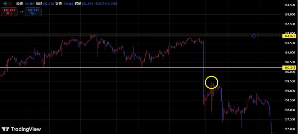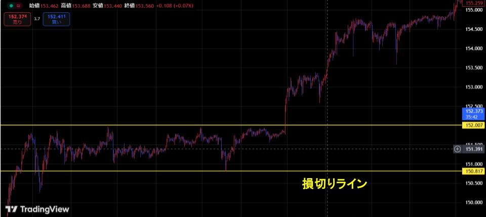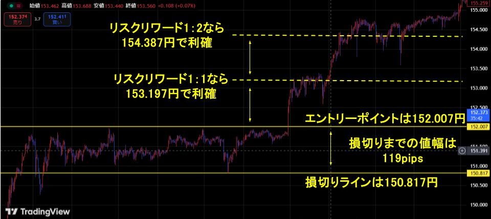 119pipsの損失を受け入れているので、狙う利益も119pipsになるように153.197円を利益確定ラインとします。