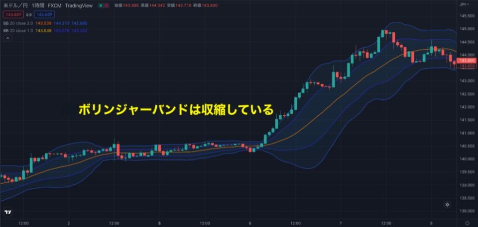このようなスクイーズが見られたあとは、バンドが拡大する「エクスパンション」が発生し、値動きが大きくなる可能性が高いとされています。