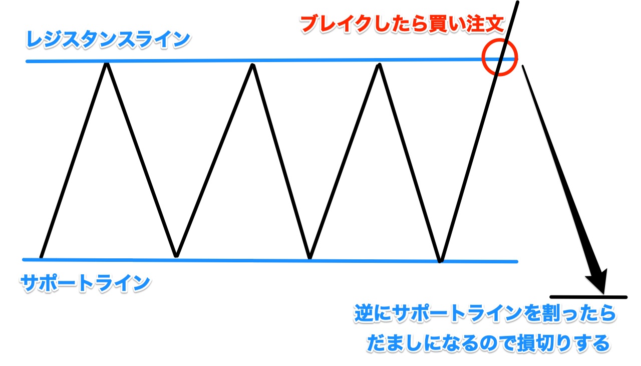 例えば、以下のようにレジスタンスラインをブレイクしたら、買い注文を入れるのが有効です。