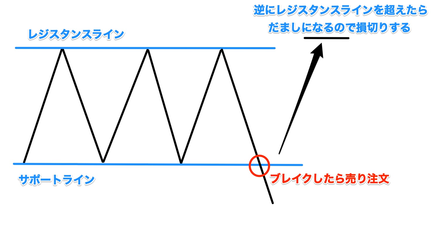 レジスタンスラインをエントリーポイントとしたときは、下図のようにサポートラインを損切りラインの目安とするのが有効とされています。