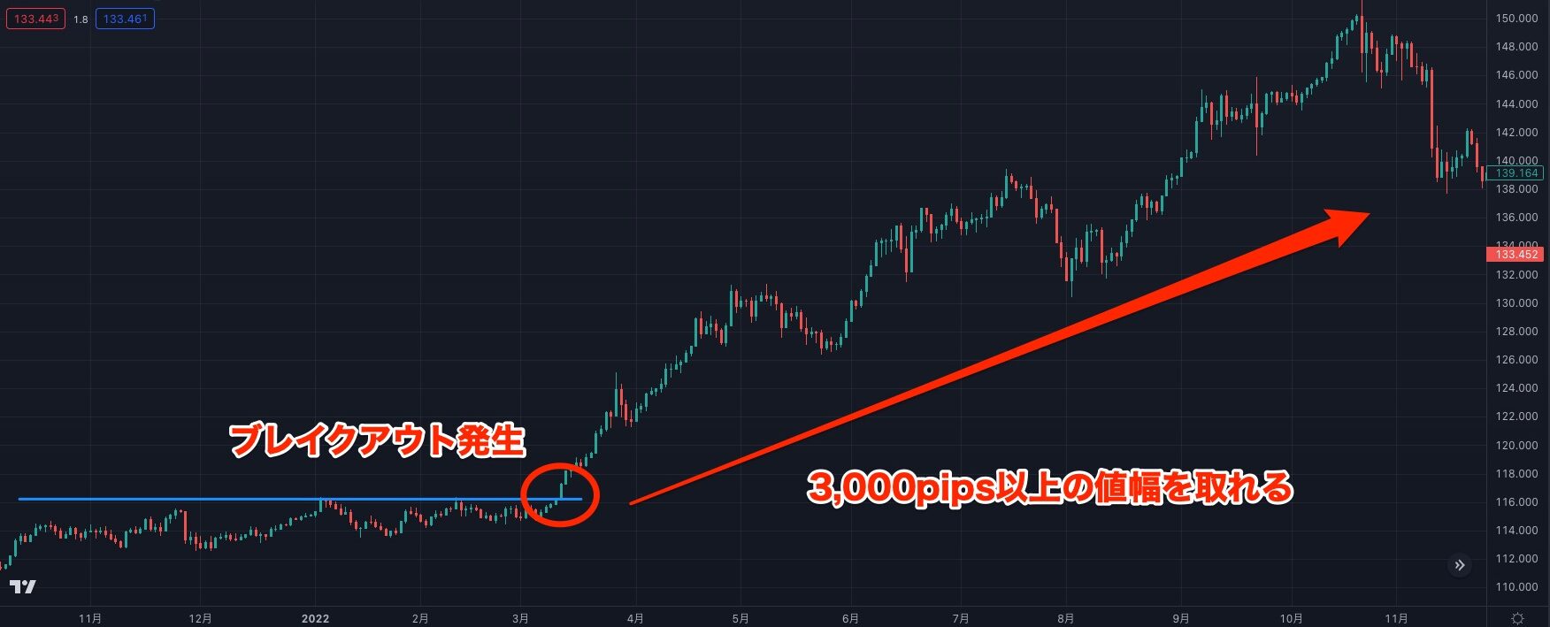 下図の米ドル/円の日足チャートでは、ブレイクアウト発生直後に買いエントリーをすれば3,000pips以上の値幅を狙えます。