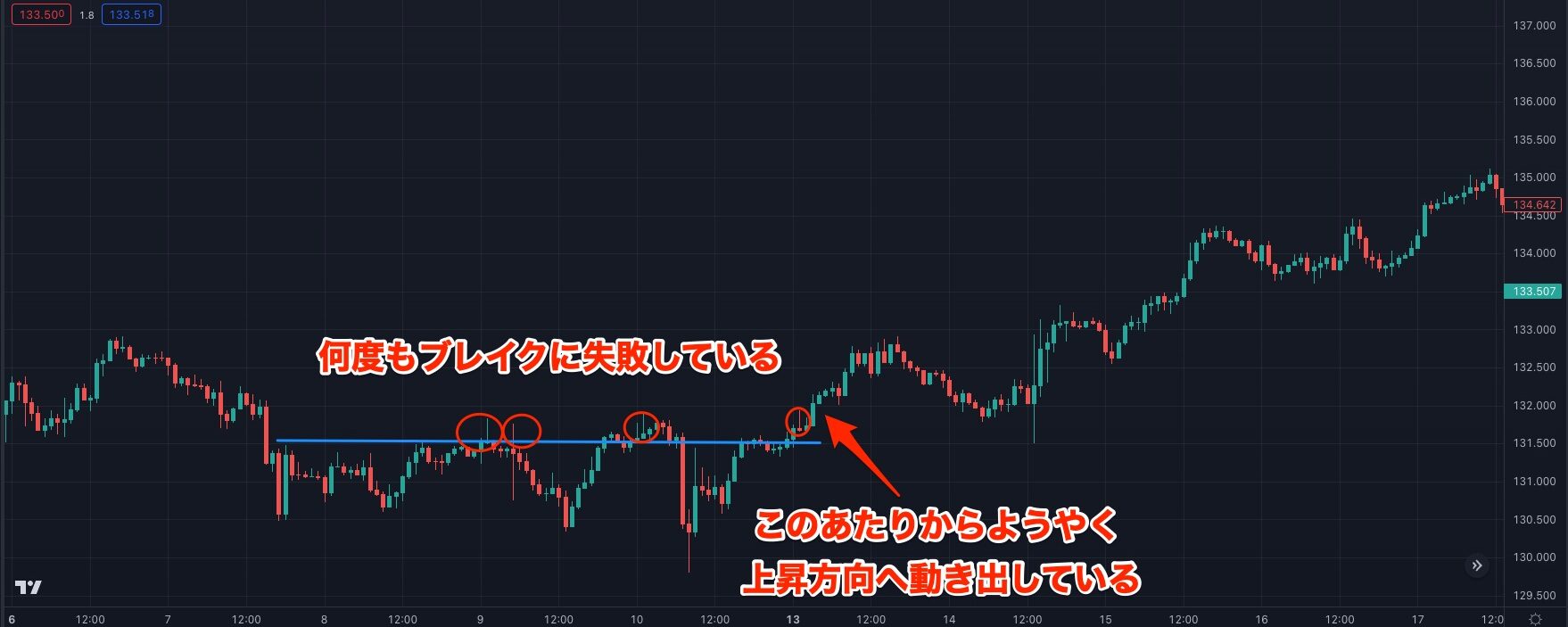 反転した回数が多いラインは、その価格帯を超えたときにブレイク後の方向へ動きが加速しやすくなります。