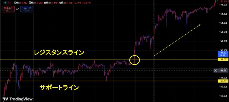 ブレイクアウト手法では、サポートラインやレジスタンスラインを突破した箇所をエントリーポイントとします。