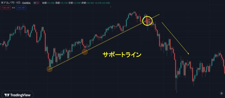 例えば、上昇トレンドが発生している下図のチャートでは、サポートラインの下抜けが確認できたときに売り注文を入れます。