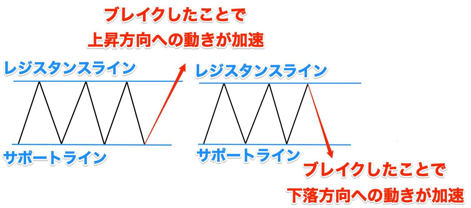 レンジ相場の場合は、下限であるサポートライン、上限であるレジスタンスラインを抜けたときにエントリーするのが効果的です。